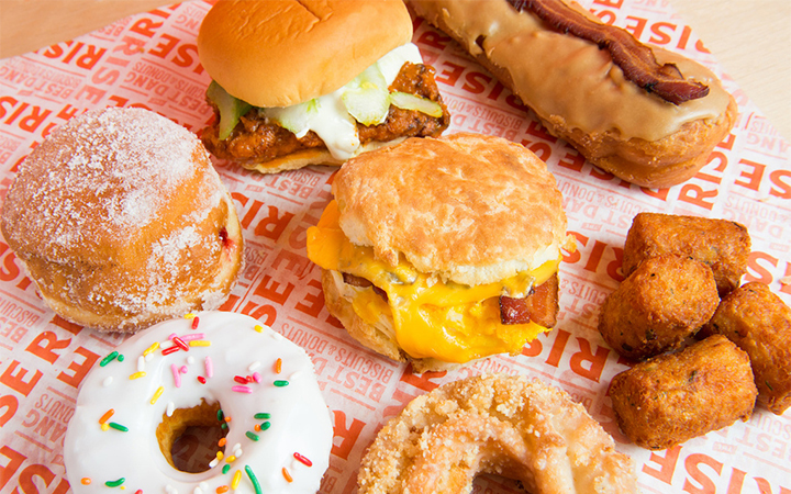Yeast and cake donuts are available throughout the day and feature flavors like the Maple Bacon Bar and Crème Brulee. Rise also serves biscuit sandwiches all day, featuring buttermilk-brined fried chicken, crispy bacon, salt-cured ham, and country sausage topped with egg, cheese, and spreads.