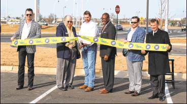 Conway Area Chamber of Commerce President and Chief Executive Officer Brad Lacy (left), Vice Chairman of the Arkansas Department of Transportation Commission Tom Schuek, ADT Director Scott Bennett, ADT Commission member Frank Scott, Collett developer Ryan Mosser and Conway Mayor Tab Townsell celebrate the opening of the two roundabouts as part of the Interstate 40/Highway 65B Interchange and Highway 286 (Dave Ward Drive) improvements near the Lewis Crossing Shopping Center on Wednesday. The project has also widened ramps for I-40 and will continue widening for Highway 286. (Andy Robertson/Staff Photo)